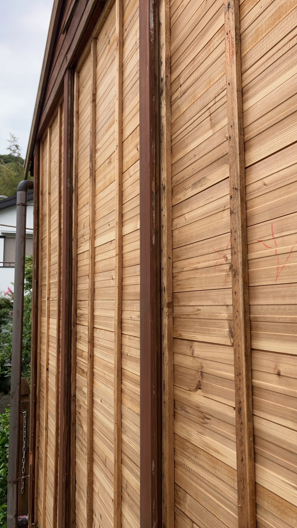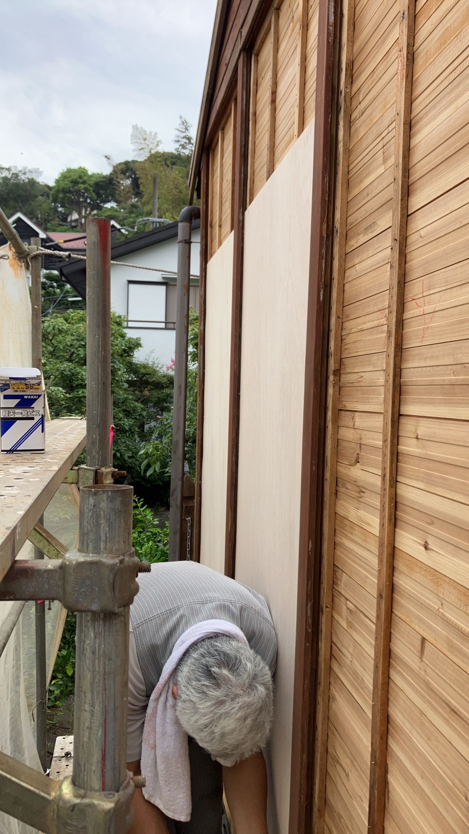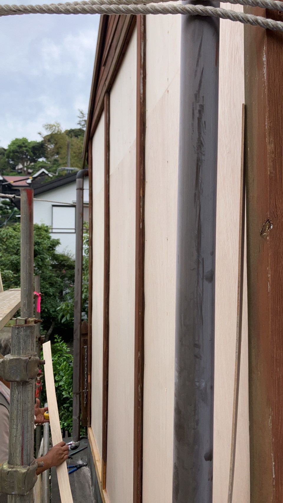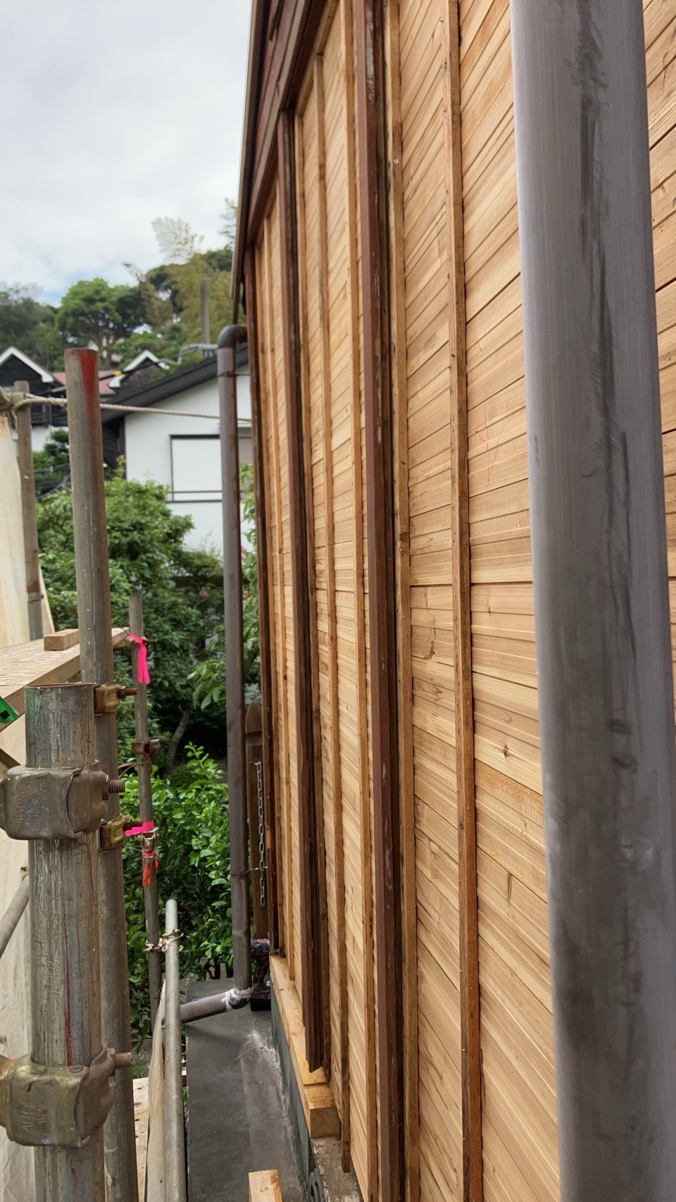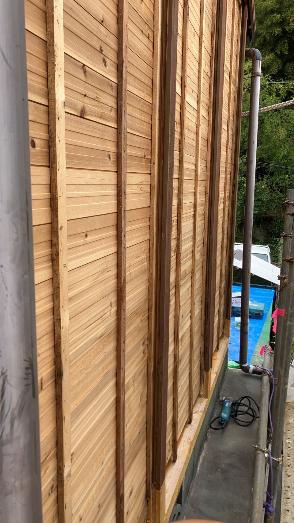 本日、新規現場の施工に入りました。木造の建物の外壁補修工事となります。