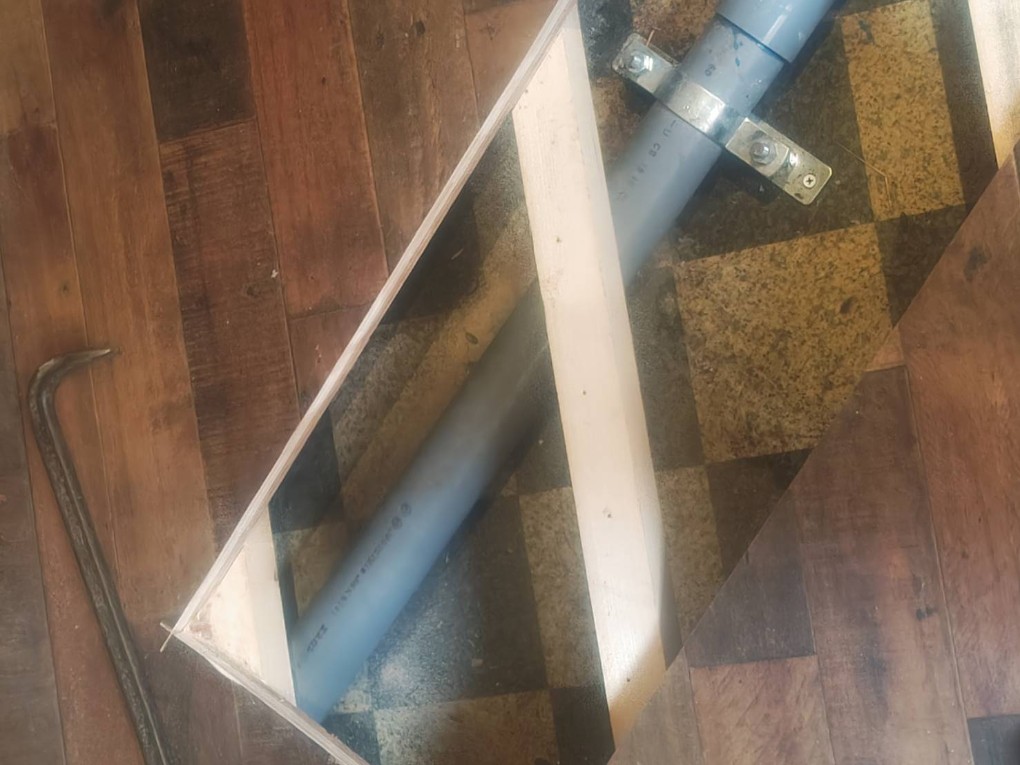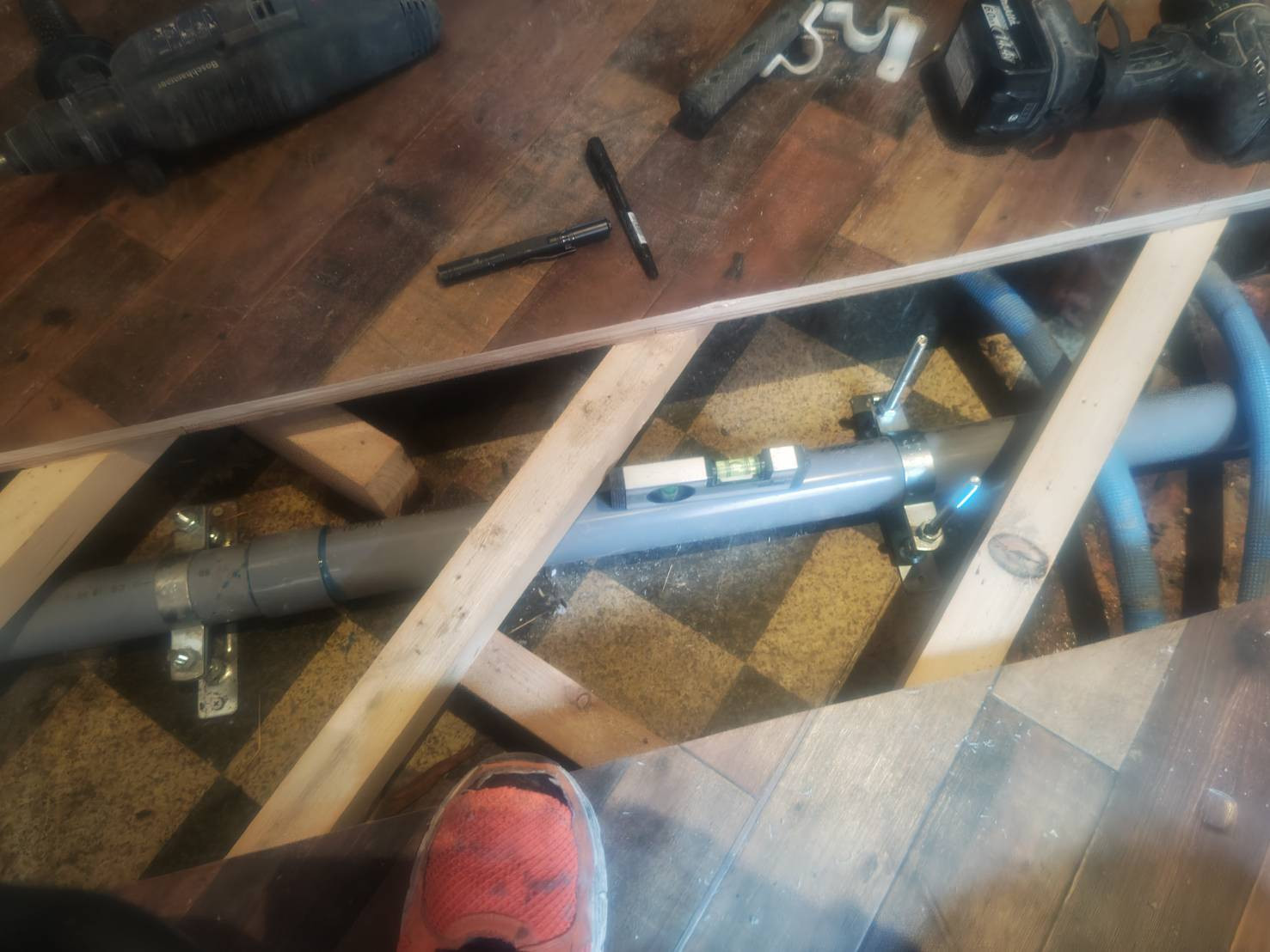 水平器を使って確認して、金具でパイプを固定します。