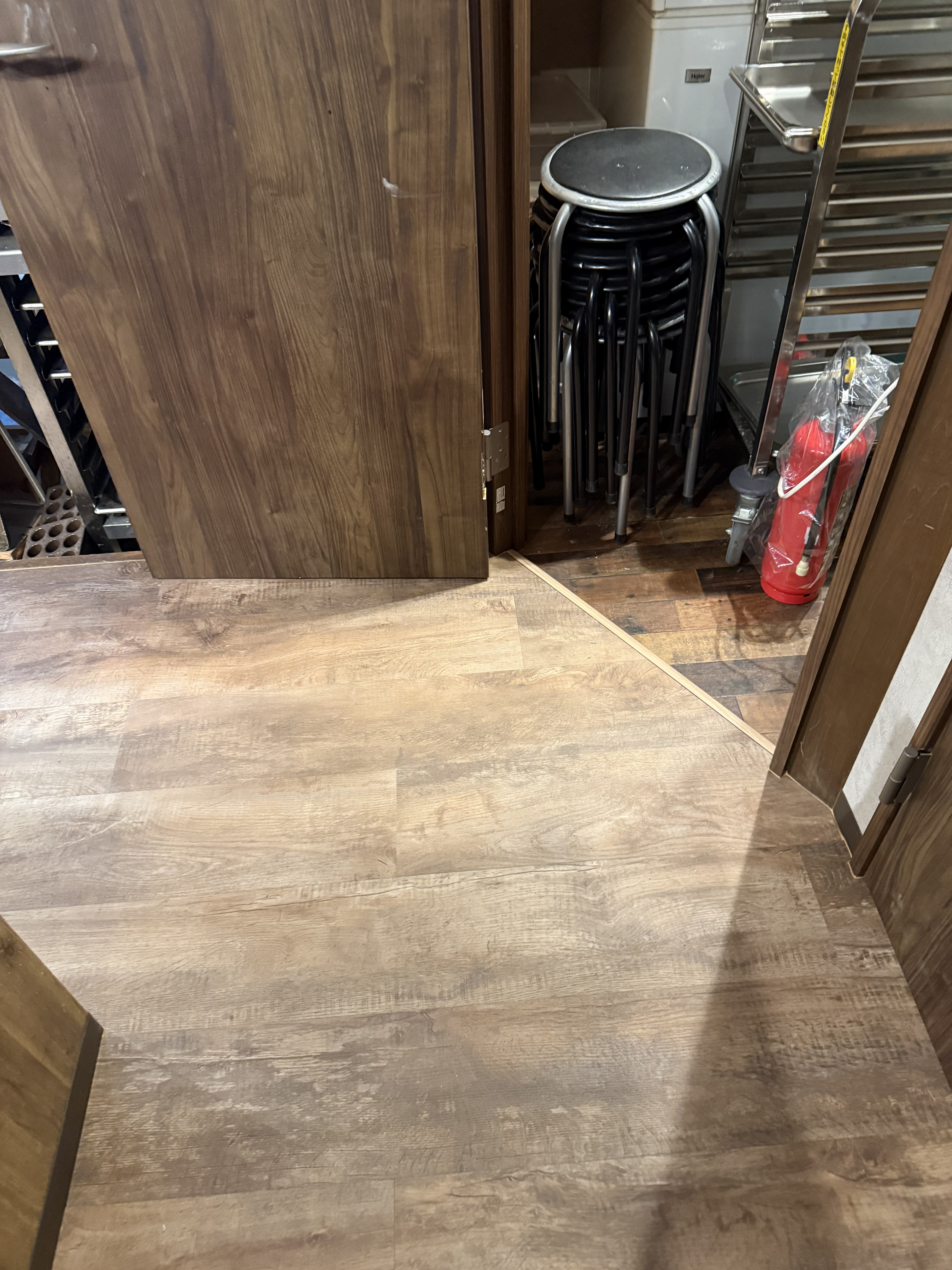 今回は部分的に張り替えているので、目立たないようなところで従来の床材と切り替えています。